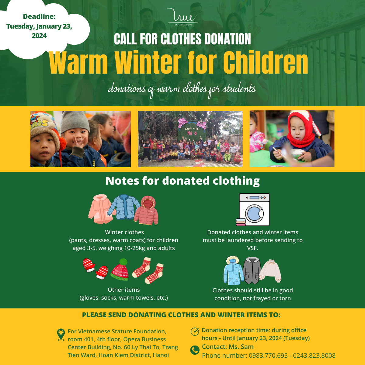 - Winter clothes (pants, dresses, warm coats) for children aged 3-5, weighing 10-25kg are preferred. In addition, VSF also accepts donations of winter clothing for adults, which can be a gift for the students’s parents.