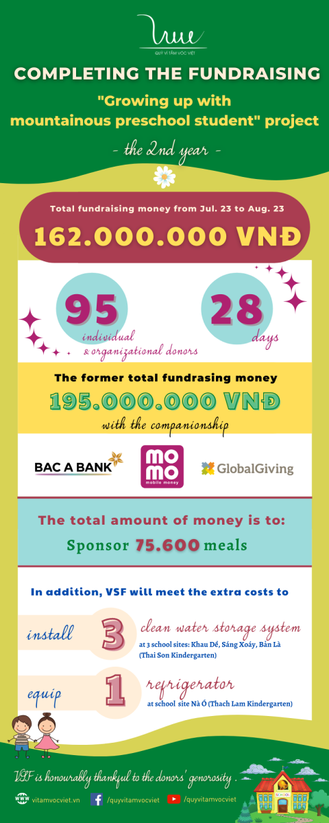 For Vietnamese Stature Foundation (VSF) is pleased to announce: Thanks to the generosity of 95 individual and organizational donors across the country, we have successfully raised funds for the 2nd year "Growing up with mountainous preschool students” project.