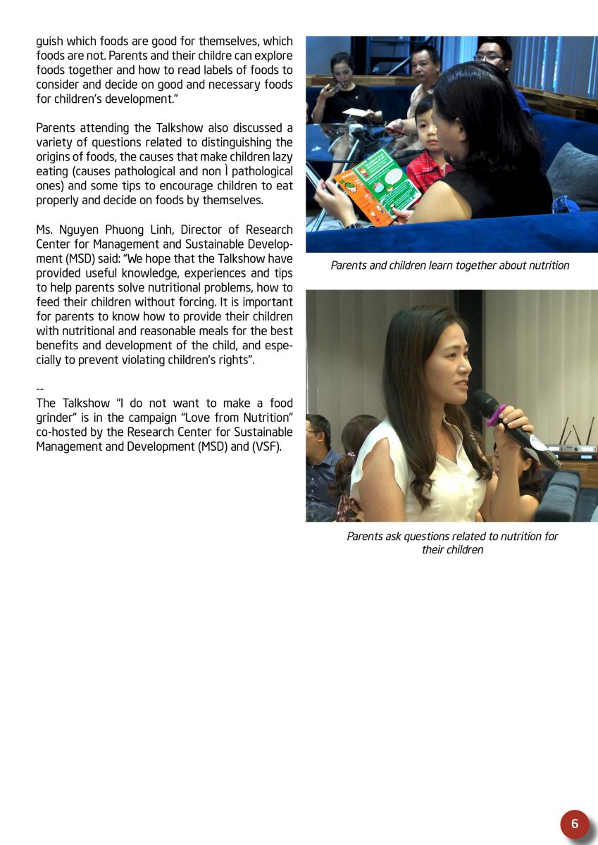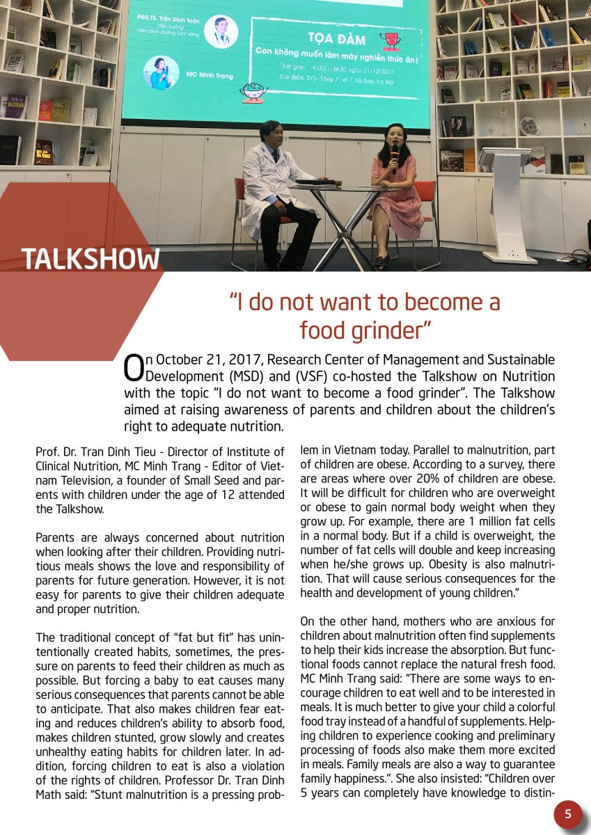 On October 21, 2017, Research Center of Mannagement and Sustainable Development (MSD) and (VSF) co-hosted the Talkshow on Nutrition with the topic “I do not want to become a food grinder”. The Talkshow aimed at raising awareness of parents and children about the children’s right to adequate nutrition.