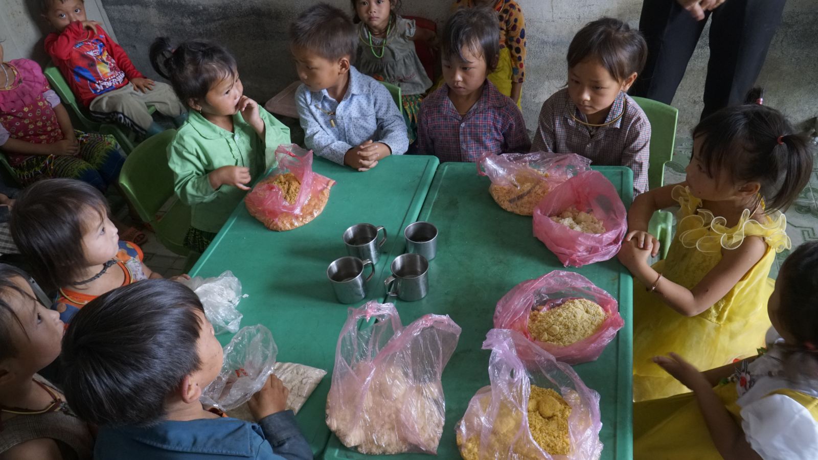Arriving at Khau Noong school during lunchtime, we had a closer look at the difficulties of the children. Lunch was held in the hot little classroom, each lunch package opened with steamed cornmeal which must be accompanied with a few glasses of water for easy eating. Several students don't have food so they have to go home. Because there is no kitchen, no water tank, and no kitchen utensils such as bowls, chopsticks, or spoons, students have to pick the food up by hand, and drink water directly from the stream.