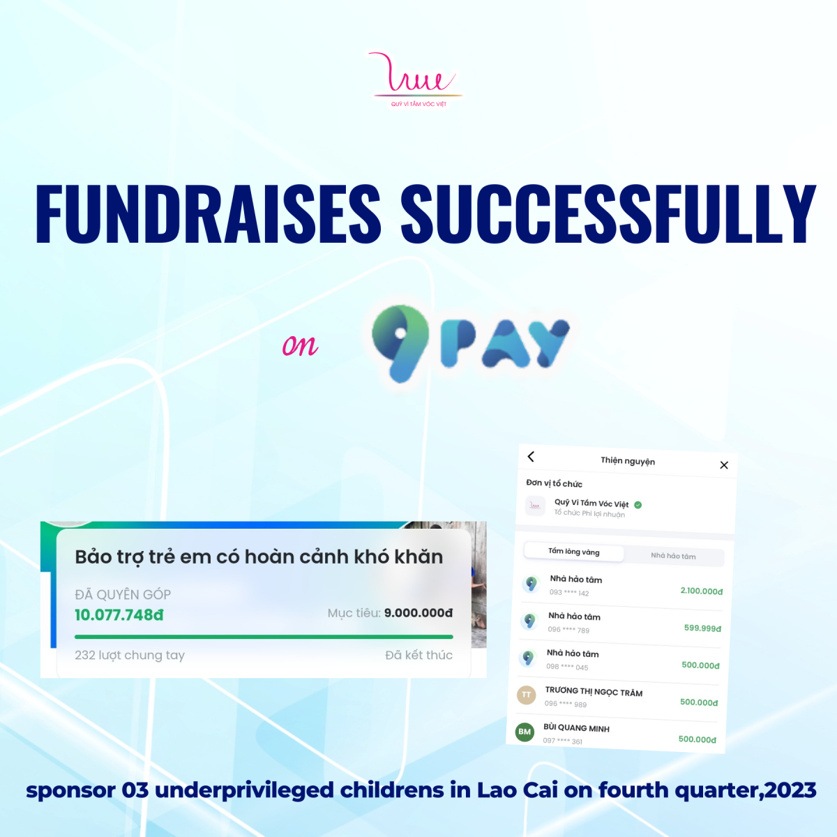Thanks to the contributions of 232 kind-hearted sponsors, we raised a total of 10,077,748 VND. VSF will sponsor 9 million VND for the 03 children in Lao Cai as planned. The remaining 1,077,748 VND will be allocated for the next phase of sponsorship.