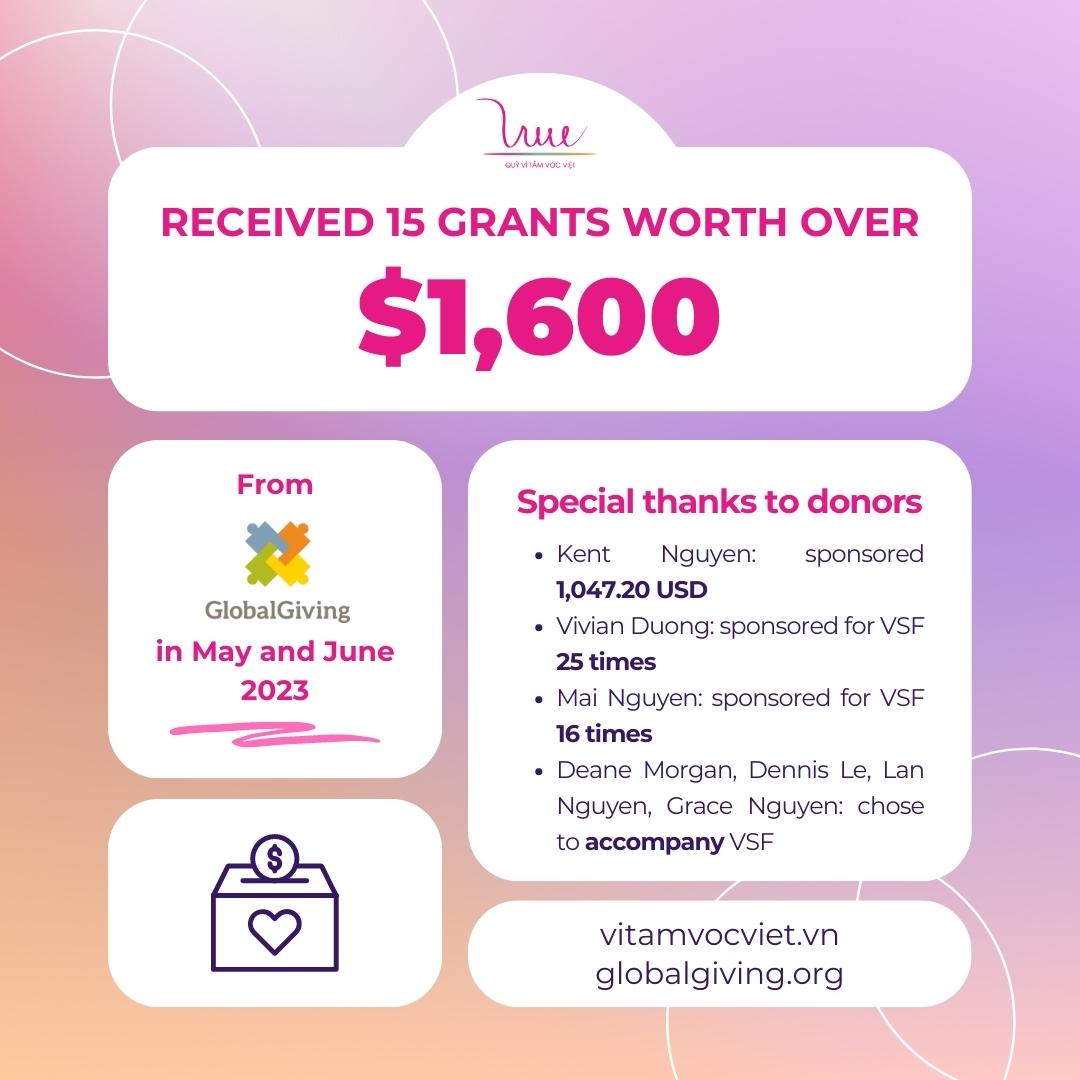 For Vietnamese Stature Foundation (VSF) is pleased to announce: In May and June 2023, through the Global Giving platform, we received 15 grants worth $1,676.61 for 04 projects.