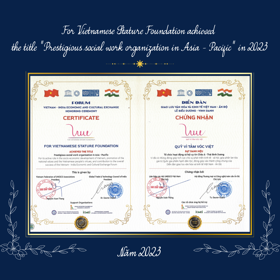 For Vietnamese Stature Foundation (VSF) is pleased to announce: We have been honored as the "Prestigious social work organization in Asia - Pacific" 2023 in India by the Vietnam Federation of UNESCO Associations and the Global Trade & Technology Council of India (GTTC India).