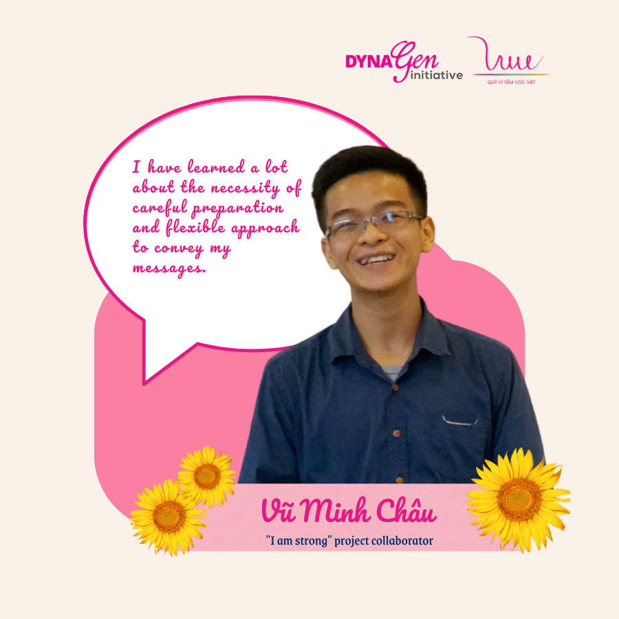Growing up from the DynaGen Initiative, 6 collaborators who have their own major, personality and hometown are 6 colorful puzzle pieces. In spite of different backgrounds, when participating in the "I am strong" project, all of them are incredibly enthusiastic, professional and dedicated. Those things come from the journey they were trained, with the guidance of the project team in general and the For Vietnamese Stature Foundation (VSF) in particular. From training sessions on gender equality, project management and evaluation, to field trips in Thanh Hoa province and lessons-sharing workshops, collaborators have gained a lot of knowledge, skills, and experiences. The joy and confidence in the eyes along with the smile full of happiness are on their faces when the collaborators share about the changes in themselves after the past meaningful journey.