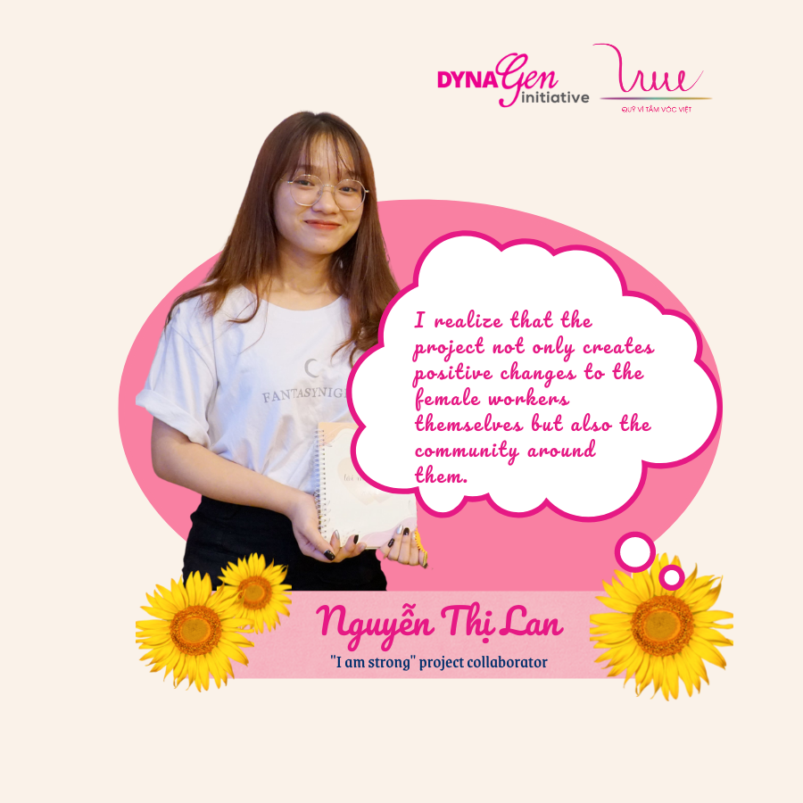 As a collaborator, Nguyen Thi Lan (Banking Academy) said: “I feel very lucky and proud to be a part of the project, because I realize that the project not only creates positive changes to the female workers themselves but also the community around them. Each time I participate in a group of workers, I hear different stories from the participants. There are stories filled up with laughter, but there are also streaming tears. After all, everyone became more active, stronger to speak up and share. Those female workers have become an inspiration to me, and made me stronger.”