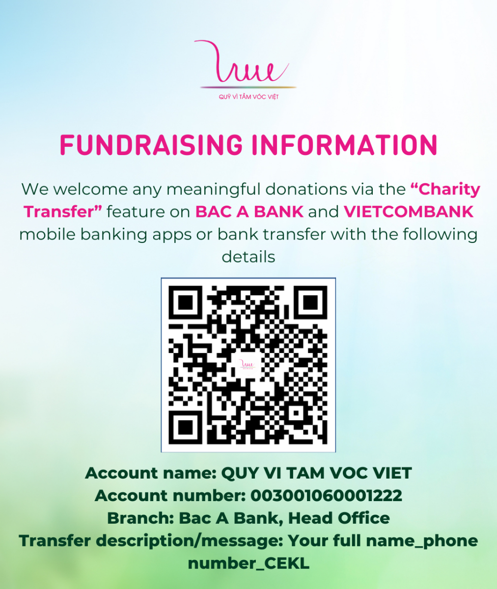 We welcome any meaningful donations via the “Charity Transfer” feature on BAC A BANK and VIETCOMBANK mobile banking apps or bank transfer with the following details: