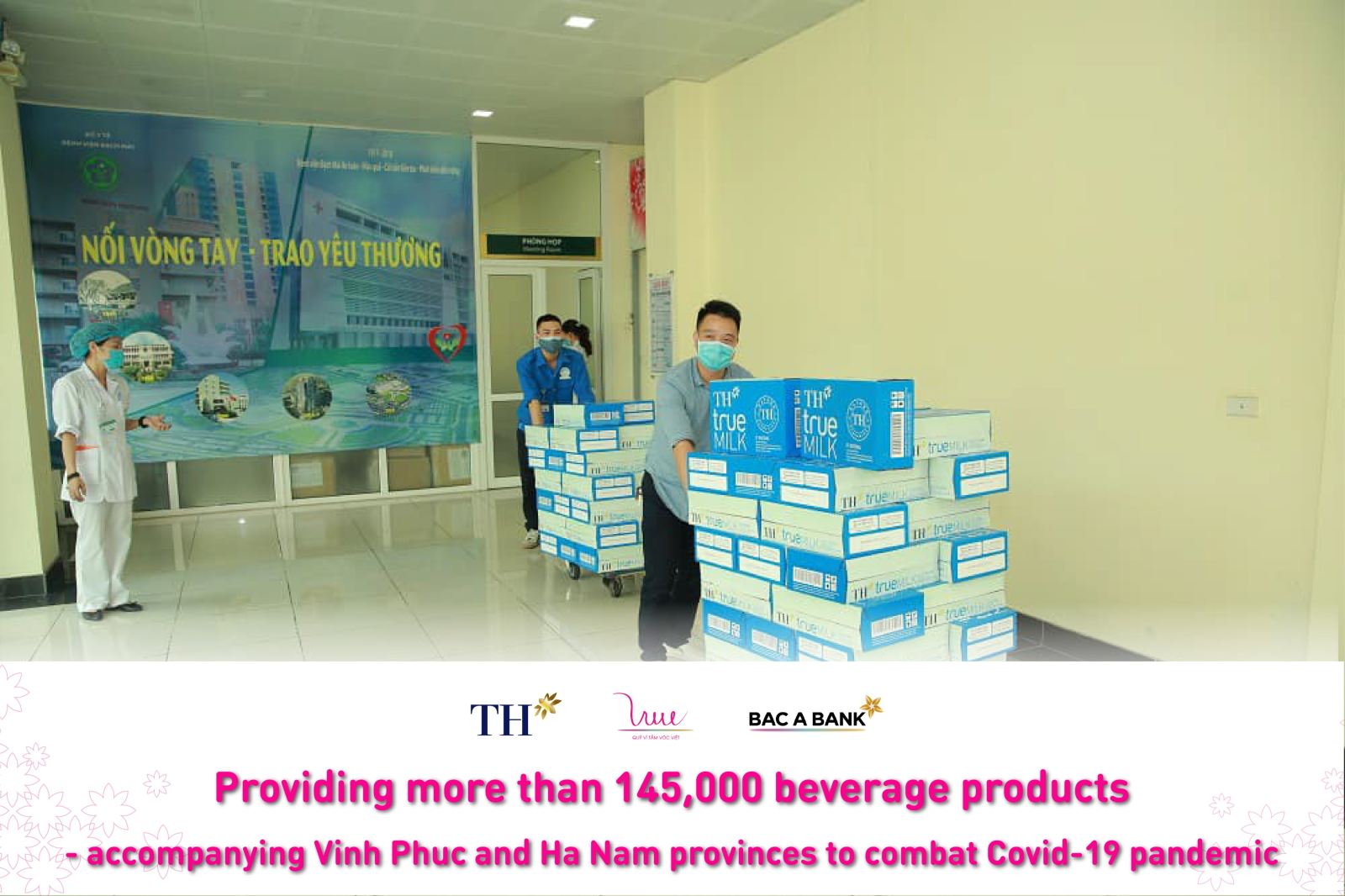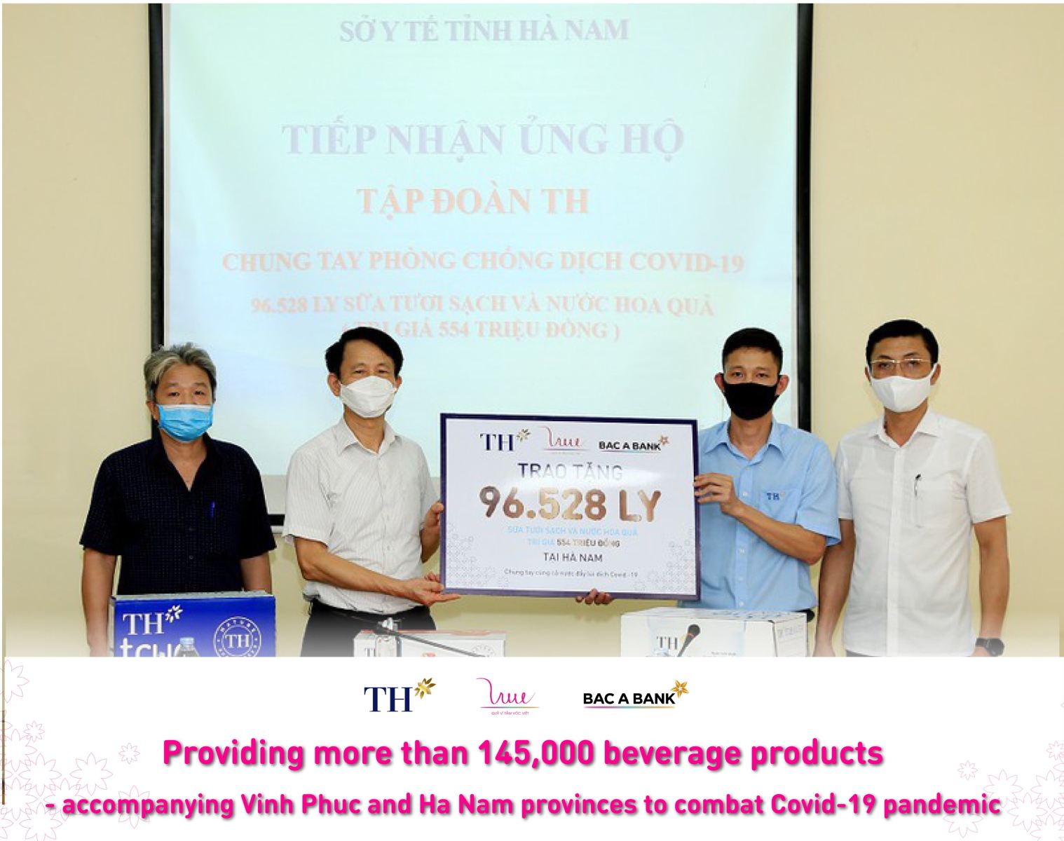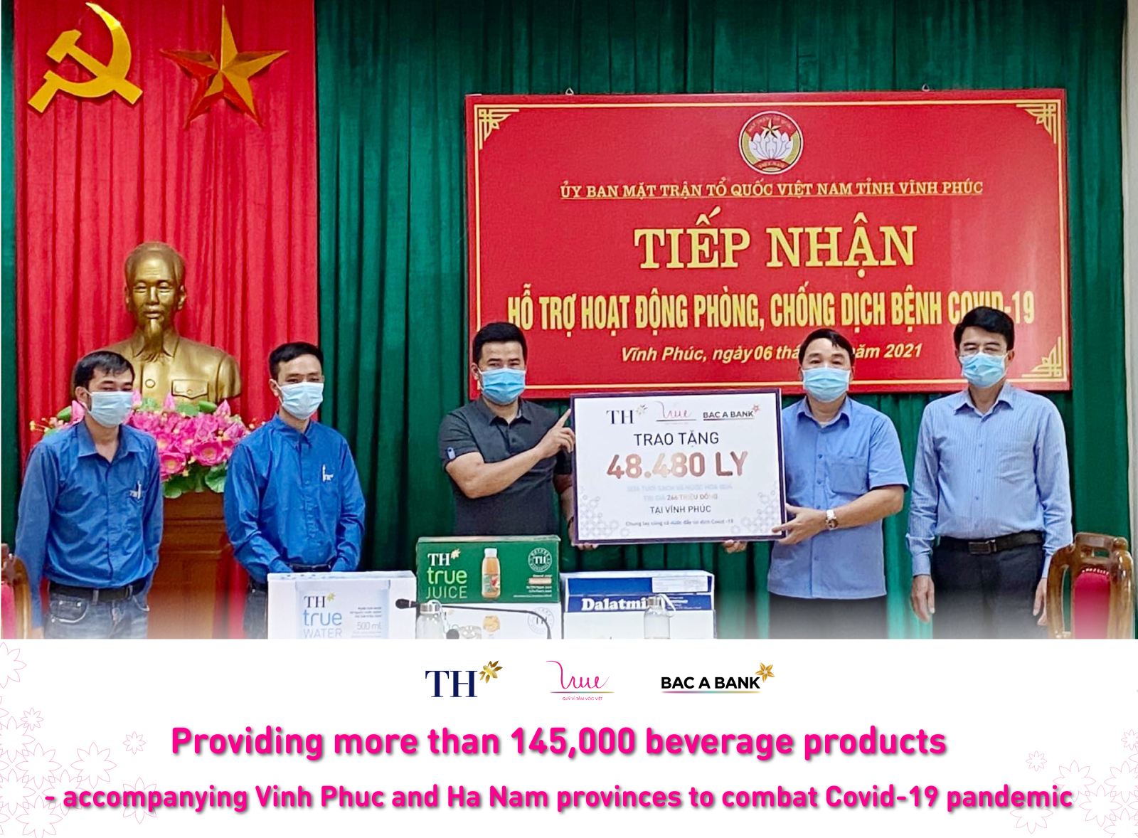 With the unanimity and prompt contribution to the fight against the Covid-19 pandemic in Vietnam, on the afternoon of May 6, TH Group and Bac A Commercial Joint Stock Bank represented by For Vietnamese Stature Foundation (VSF) urgently implemented the donation of more than 145,000 healthy beverages to Vinh Phuc and Ha Nam - two provinces adversely affected by the Covid-19 pandemic that just broke out in early May. Vinh Phuc, Ha Nam province were given 48,480 products and 96,528 ones respectively. The total value of beverage products is nearly 1 billion VND.