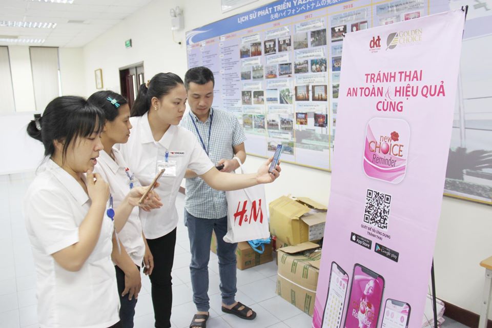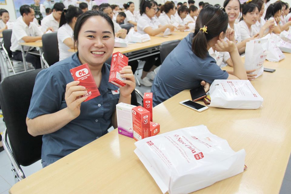 Yazaki employees receive gifts of contraception and health care products such as OK condoms, Newchoice contraceptive pills, Da Huong women's hygiene, and so on