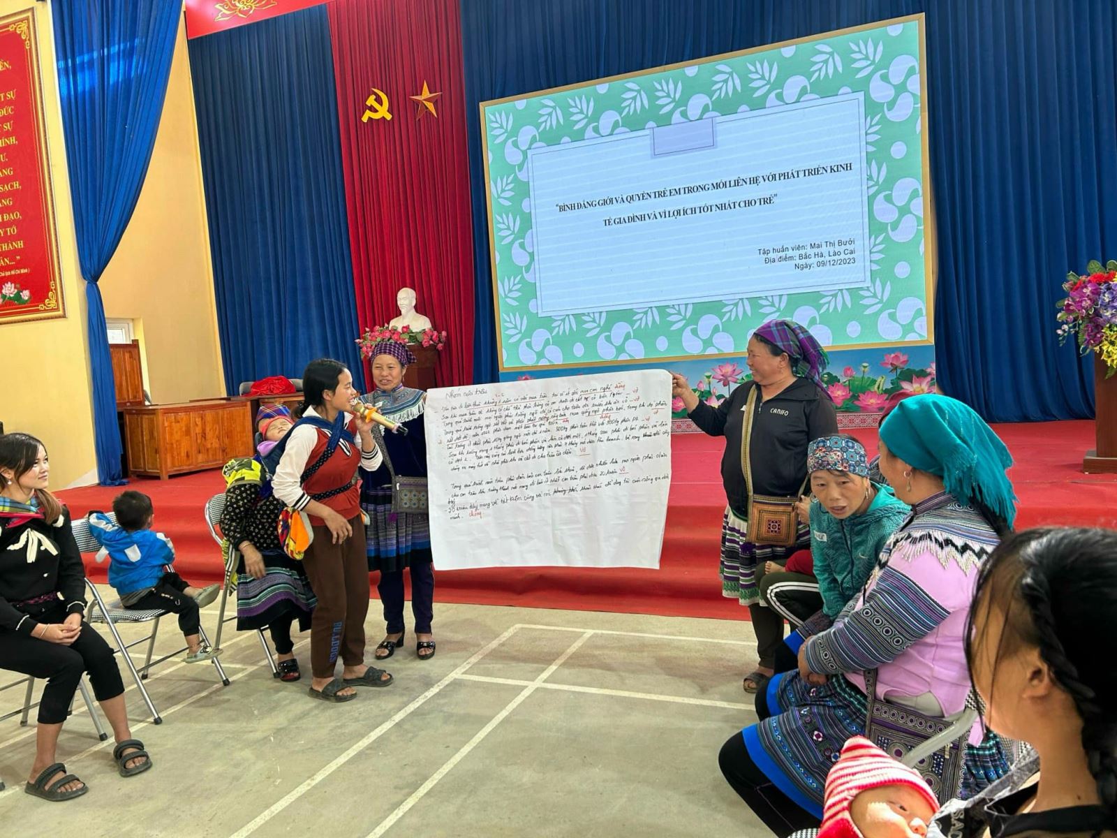 Participants in the training course were 30 H'Mong ethnic women in difficult circumstances, coming from 5 villages in the Thai Giang Pho commune. Through group activities, presentations, and debates, the women jointly identified and analyzed: