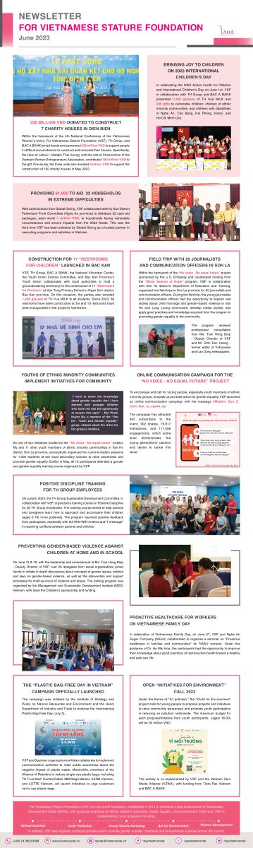 In June 2023, For Vietnamese Stature Foundation (VSF) continued to sponsor 350 million Vietnam Dong to support the construction of gratitude houses in Dien Bien and began 17 restrooms’ construction for students in Bac Kan. Besides, the activities of the project “No voice - no equal future” for young journalists, communication officers and youths of ethnic minority communities have completed with the significant results; the project “Youth for Eenvironment” is calling for “green” initiatives from young people; and together with the stakeholders, VSF has been acting to respond to the campaign “Plastic Bag-Free Day in Viet Nam”.